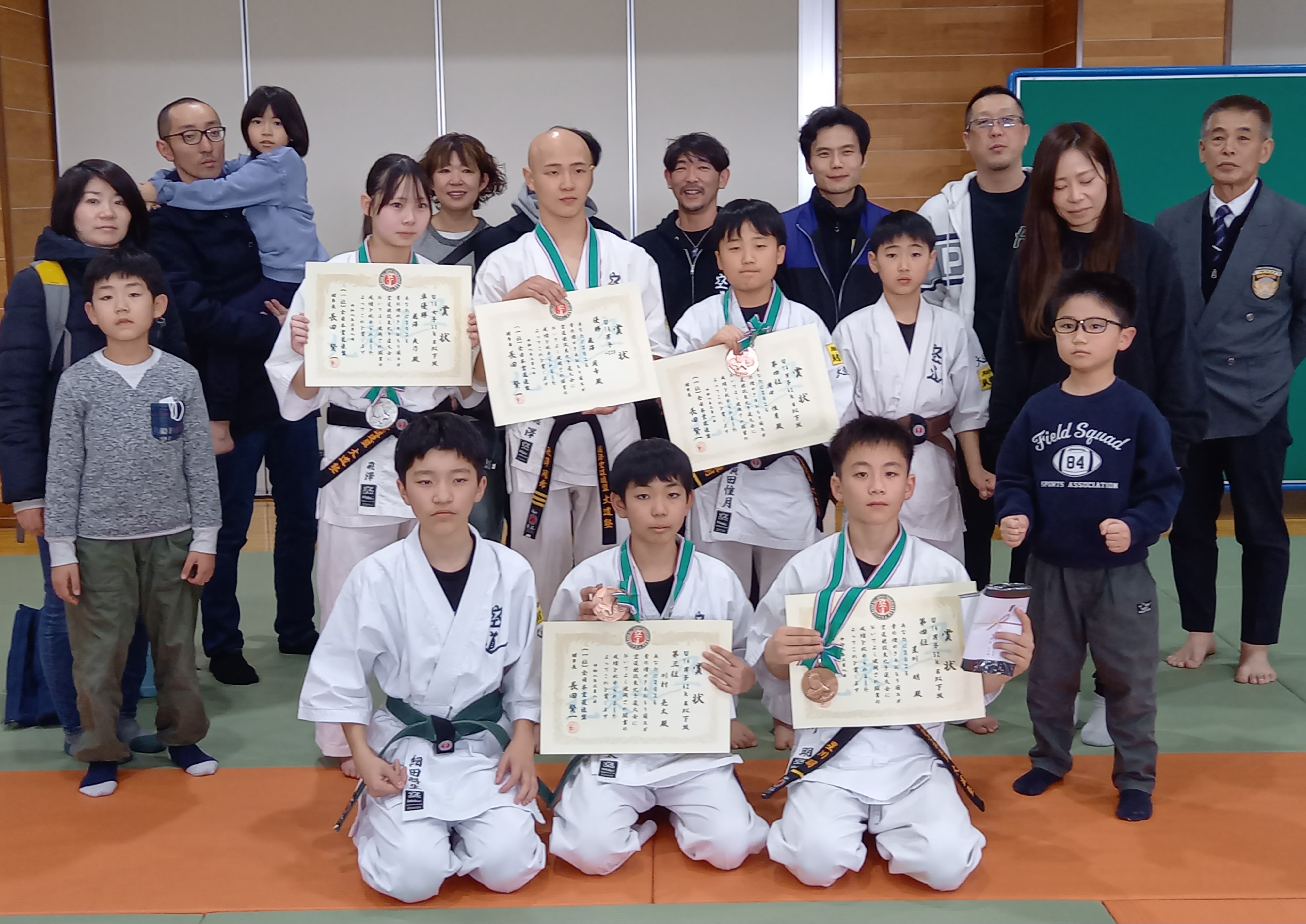 青の煌めきあおもり国スポ 空道競技東北地区予選大会開催!! あおもり国スポ空道競技東北地区予選大会が3月8 日(日)登米市南方武道伝承館において開催された。 本東北大会に、当支部から7名が出場し熱き魂を持った若獅子による白熱した戦いが繰り広げられた。大会の結果は、U18 220以下の部 優勝 飛澤周希(盛岡中央高等学校1年)U16の部U53s以下の部 準優勝 飛澤爽乃(盛岡市立城西中学校2年)U14 42kg以下の部 第3位 川村亮太(盛岡市立仁王小学校6年生)U14 42kg以下の部 第4位 廣田惟月(盛岡市立向中野小学校5年生)U14 52kg以下の部 第4位 星川明(盛岡市立仁王小学校6年生)それぞれ入賞となった。 当支部出場選手は、日頃の精進がみられ個々の選手が課題と向き合い先生の指導を真摯に受け取め稽古に邁進していった結果が功を成したものと確信します。 今後も地域の皆さまから引き続き暖かいご声援をお願い申し上げ、本大会の報告とします。